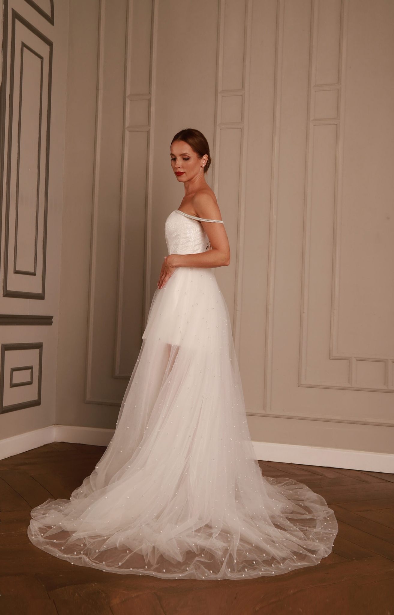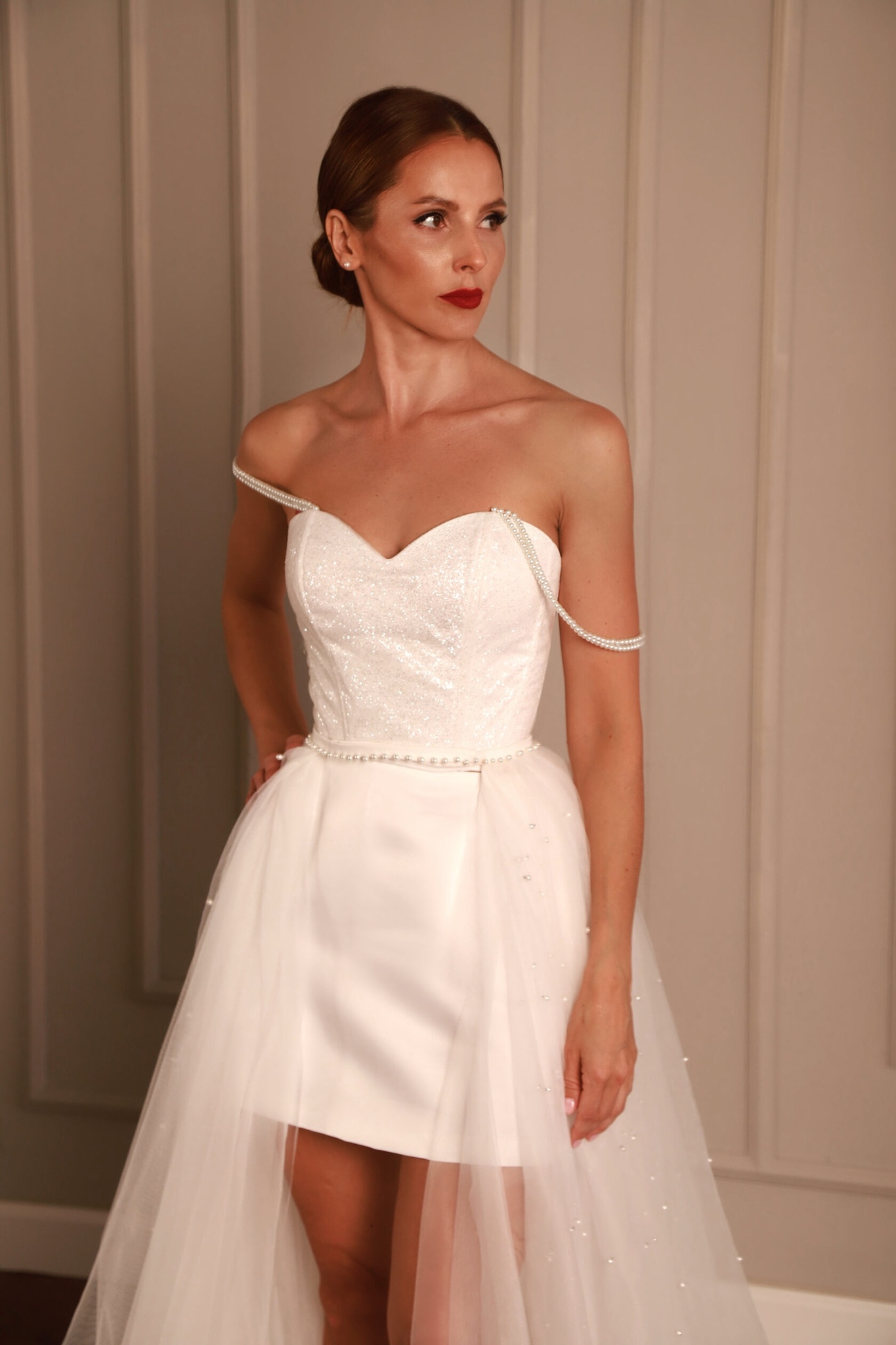 Стильный и очень нежный свадебный образ. Топ на основе классического корсета с нежной маленькой атласной юбкой в сочетании с длинной съемной фатиновой юбкой со шлейфом - тренд свадебной моды.